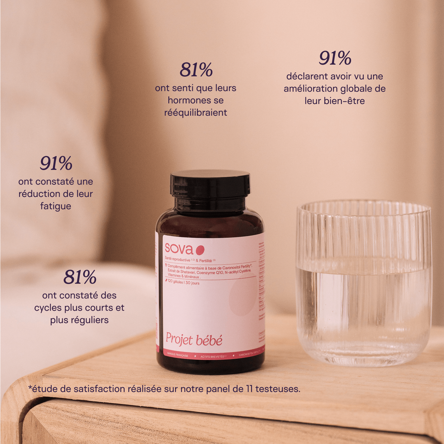 "J’ai eu la chance de tester le complément Projet Bébé pendant 3 mois, et j’en suis ravie. Dès le premier mois, j’ai remarqué une nette amélioration de mes cycles menstruels, plus réguliers et moins douloureux. J’ai aussi constaté une meilleure lubrification pendant les rapports, ce qui a vraiment amélioré mon confort. Ma libido, souvent en berne à cause du SOPK, a également repris petit à petit. C’est un produit que je recommande sincèrement à toutes celles qui cherchent un accompagnement naturel et efficace. Merci Sova !"